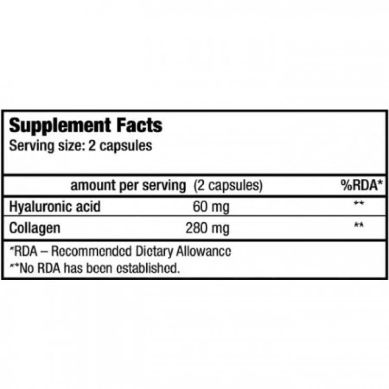 Sastojci: hidrolizovani goveđi kolagen; sredstvo za povećanje zapremine: kalcijum-fosfat; omotač kapsule [želatin, sredstvo za glaziranje: šelak, boja: oksidi i hidroksidi gvožđa, regulator kiselosti: amonijum-hidroksid, kalijum-hidroksid]; hijaluronska kiselina (sadrži SOJU); sredstva protiv zgrudvavanja: silicijum-dioksid, magnezijumove soli masnih kiselina.