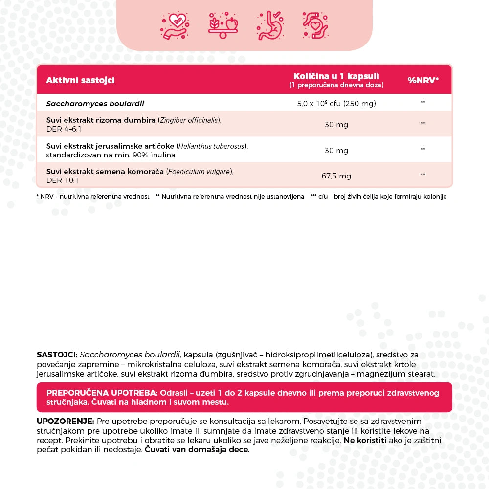 Ciljana Prevencija Dijareje: Soj Saccharomyces boulardii u visokoj dozi od 5 milijardi jedinica po kapsuli efikasno deluje protiv dijareje izazvane antibiotskom terapijom, putovanjima i naglim promenama u ishrani.